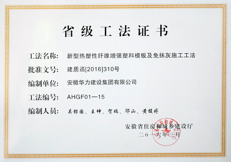 近日,从安徽省住房和城乡建设厅获悉,华力建设独家或联合申报的《新型热塑性纤维增强塑料模板及免抹灰施工工法》、《外爬架支座异形支承结构施工工法》等两项工法,获评省级工法。