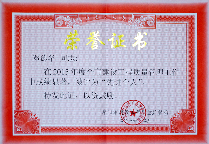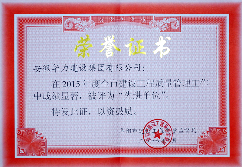 日前,阜阳市建设工程质量监督局发文《关于表彰2015年度全市建设工程质量管理工作先进单位和先进个人的通知》(阜建监〔2016〕19号),通报表彰在2015年工程质量监督管理、工程质量标准化建设和工程质量治理两年行动工作中取得显著的成绩的20家先进单位及47名先进个人。安徽华力建设集团有限公司获得先进单位,阜合家园三期项目部郑德华、临泉辉隆大市场项目部琚向东获得先进个人,是受表彰的施工单位中人数最多的一家。