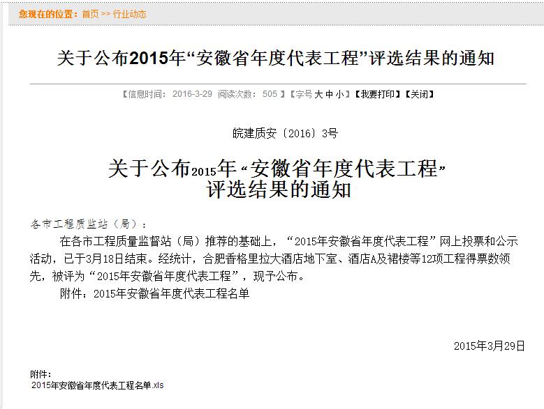 2015年“安徽省年度代表工程”推选活动由安徽省建设工程质量安全监督总站主办,旨在展示我省工程建设成就,树立典型,全面提升安徽省工程建设质量。