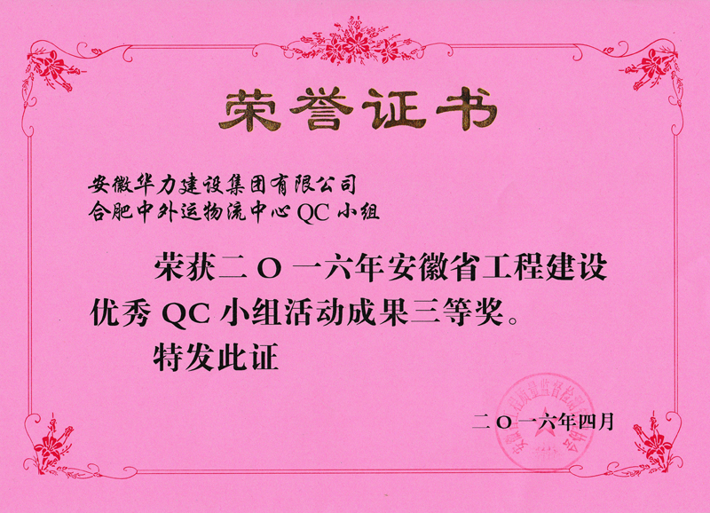为推动全省工程建设QC小组活动开展,提升全省施工企业的质量管理水平,省建筑业协会会同有关部门,每年开展一次QC小组成果发布。今年4月20日组织召开了2016年全省工程建设QC成果发表会。经评审,50个小组获得优秀QC小组一等奖, 63个小组获得优秀QC小组二等奖, 122个小组获得优秀QC小组三等奖。华力建设正奇金融广场施工总承包工程QC小组的“提高高处作业吊篮施工的安全性”获一等奖;华力建设安建大实验综合楼工程QC小组的“提高地下基坑工程集水明排排水效率”、华力建设合肥滨湖菊园项目部QC小组的“提高应用新型塑料模板情况下的剪力墙免抹灰工程施工质量合格率”同获二等奖;华力建设合肥中外运物流中心QC小组的 “提高大跨度钢结构厂房混凝土地面施工质量”获三等奖。