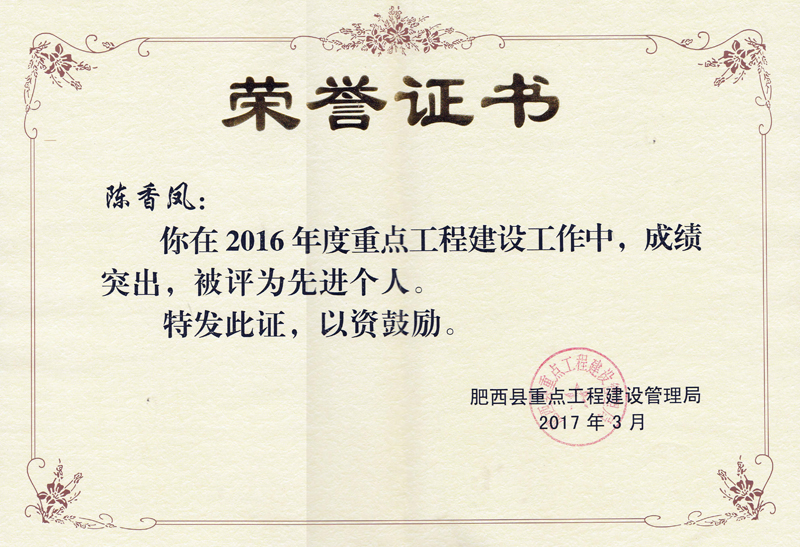 2017年3月15日下午,“肥西县重点局2017年重点工程推进会”在县委党校报告厅隆重举行。会上表彰了2016年度的重点工程领域的先进单位和先进个人。华力建设被授予“质量安全工作先进单位”,建造师陈香凤被授予“重点工程建设先进个人”。