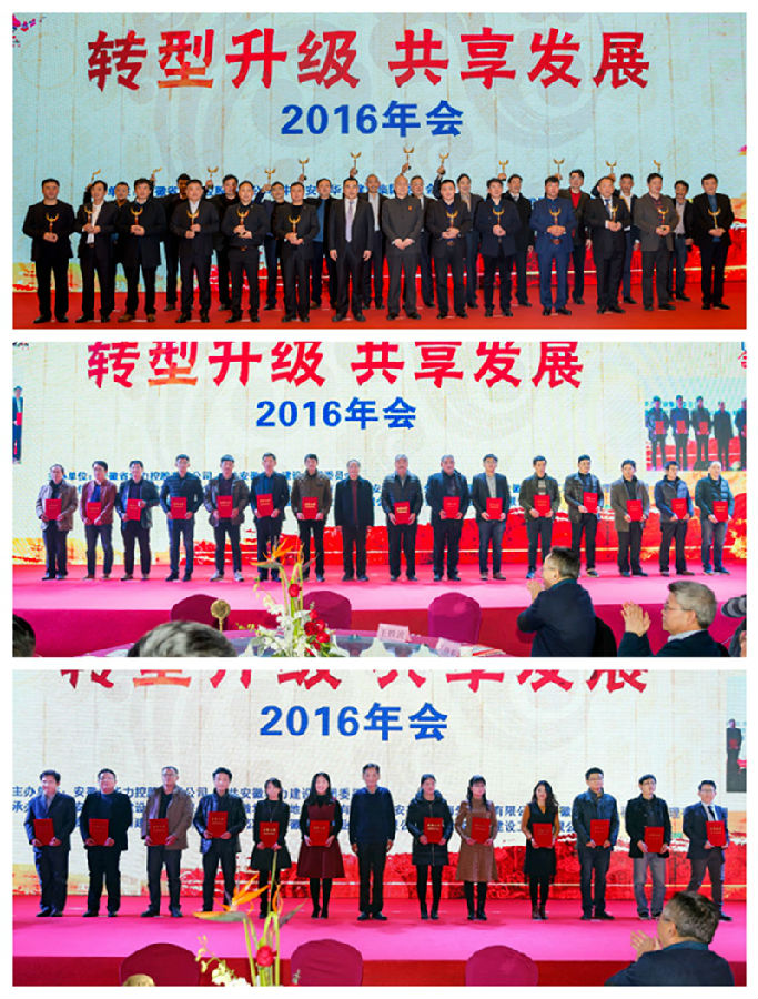 2017年会上表彰优秀项目经理、优秀管理干部、优秀班组、优秀党员、团员等代表在台上领奖