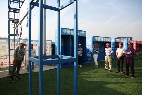 媒体一行听取了华力安全生产工作举措的详细介绍,观看了安全生产工作介绍视频;随后在王亮总经理的引领下,实地考察D组团工程现场的安全生产工作开展情况,深入了解安全防护措施样板展示区、平衡木、高处坠落、物体打击等体验设施,并向施工工人发放安全生产相关手册。