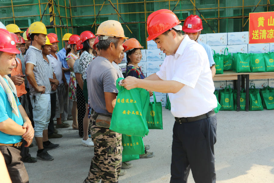 孔晓宏市长代表黄山市委、市政府为一线工人们送上了防暑降温物品,并亲切询问了解工人们在高温天气下的工作及生活情况,叮嘱他们在夏季高温作业时一定要注意安全。