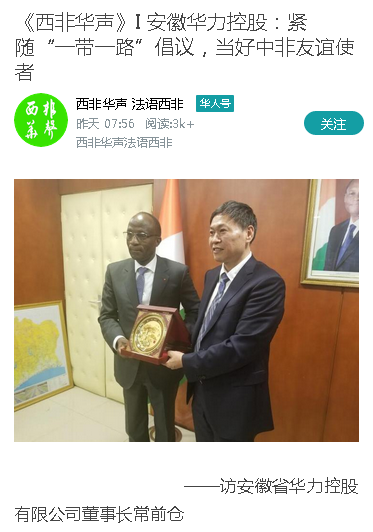 2018年9月9日至16日,华力控股董事长常前仓在科特迪瓦考察、出席项目签字仪式期间,接受了当地《西非华声报》记者专访,表达了华力海外公司抓住中非合作论坛北京峰会的机遇,进一步增强在非洲投资建设的愿景和信心。《西非华声报》是当地的一家华人全媒体平台,旨在报道西部非洲的时政、经济、法律、人文信息,报道当地华人、华侨、华商的生产生活动态,为当地华人及国内赴非人员提供有关服务。下面是专访全文。