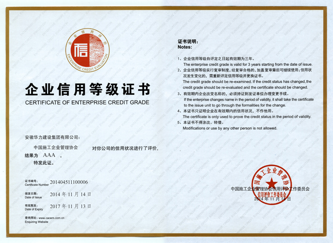 日前,从中国施工企业管理协会获悉,安徽华力建设集团有限公司被评为行业内信用最高等级——“企业信用评价AAA级信用企业”。