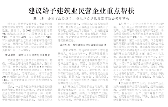 在2015年全国“两会”召开之际,《中国建设报 建筑半月谈》特辟专版作专题报道,邀请建筑行业代表就新常态下建筑业改革发展作深入探讨,促进建筑业持续、健康、快速发展。省政协委员、安徽华力建设集团有限公司董事长王坤,受邀撰文《建议给予建筑业民营企业重点帮扶》,指出:民营建筑业已然成为安徽省传统的支柱产业、富民产业和优势产业。为了更好地发挥建筑业的支柱作用,促进安徽建筑业加快转型升级发展,提出了个人独到的见解,呼吁:给民营建筑业企业重点帮扶。