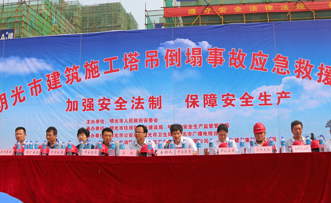 2015年7月4日上午,明光市大型设备倒塌事故应急救援演练活动,在华力建设施工的明光市金阳光阳光城工地举行。这次应急演练由明光市人民政府安全生产委员会主办,住建局、安监局承办;明光市公安局、卫生局、广播电视台、金阳光置业有限公司、安徽华力建设集团有限公司协办,并由华力建设具体落实的一项安全生产活动。明光市分管市长王政及相关单位负责人参加了活动。活动由住建局刘胜田局长主持,华力公司工程部周璜处长担任公司应急领导小组组长, 具体指挥救援演练,明光市的施工企业、监理企业负责人观摩了活动。