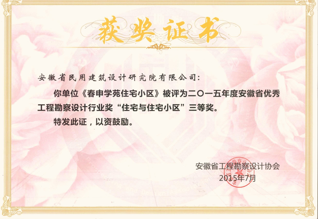 日前,从安徽省工程勘察设计协会获悉,刚刚公布的 “2015年度安徽省优秀工程勘察设计行业奖”获奖项目名单中,安徽省民用建筑设计研究院有限公司榜上有名,该院设计的《寿县春申学苑住宅小区》荣获“住宅与小区”奖项三等奖。