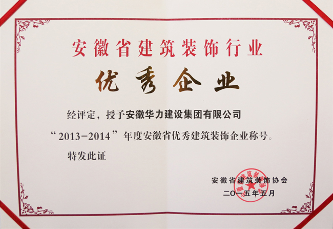 安徽省建筑装饰协会根据《关于开展“2013—2014”年度安徽省优秀建筑装饰企业评选工作的通知》(皖装协[2015]1号)及《关于评选2015年安徽省建筑装饰工程优秀项目经理的通知》皖装协[2015]2号)文件精神,组织专家评审并公示,共有安徽华力建设集团有限公司等46家企业,王平、柳杰等230名项目经理符合评选条件,并进行公示、公布。