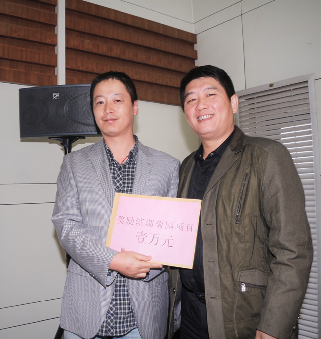总经理王亮(右)为菊园项目负责人邵山颁发奖金
