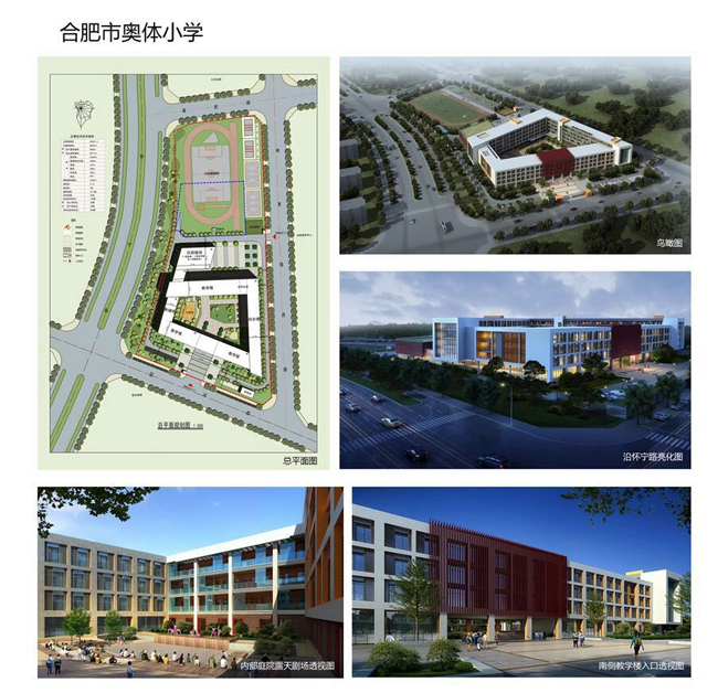 合肥市奥体小学位于政务区怀宁路与演武路交口东南角(奥体中心西侧),规划占地面积50亩。依据规划布点要求,学校规模为48个班,能容纳2400名学生就读。学校总建筑面积约30000㎡(框架结构),其中还包括教学楼、行政办公楼、实验楼、风雨操场和地下车库等。
